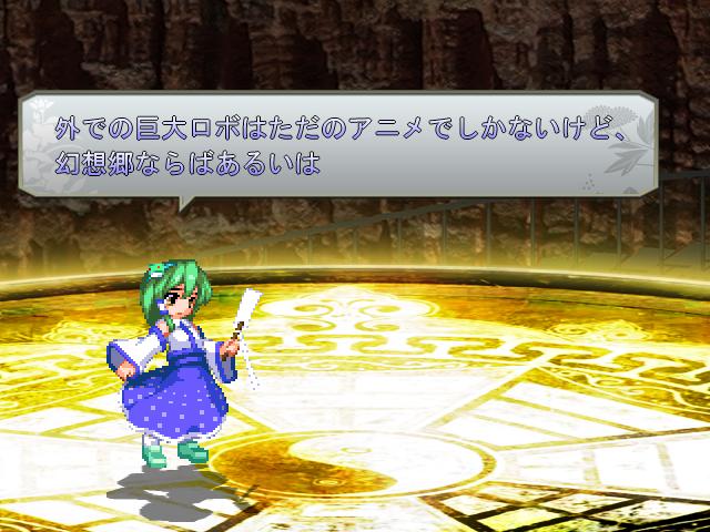 非想天則の正体は巨大ロボに違いないと予想する早苗さん。